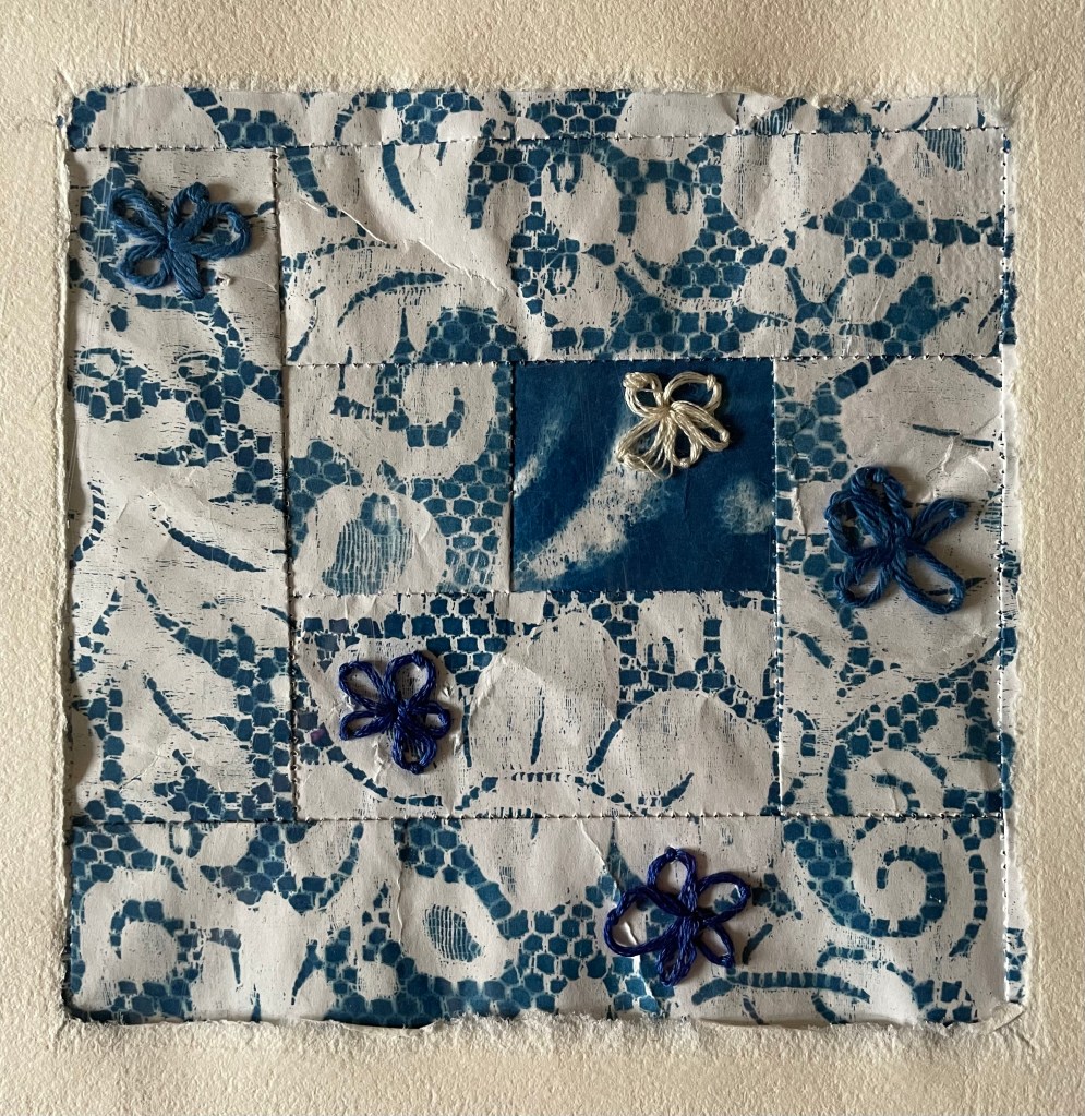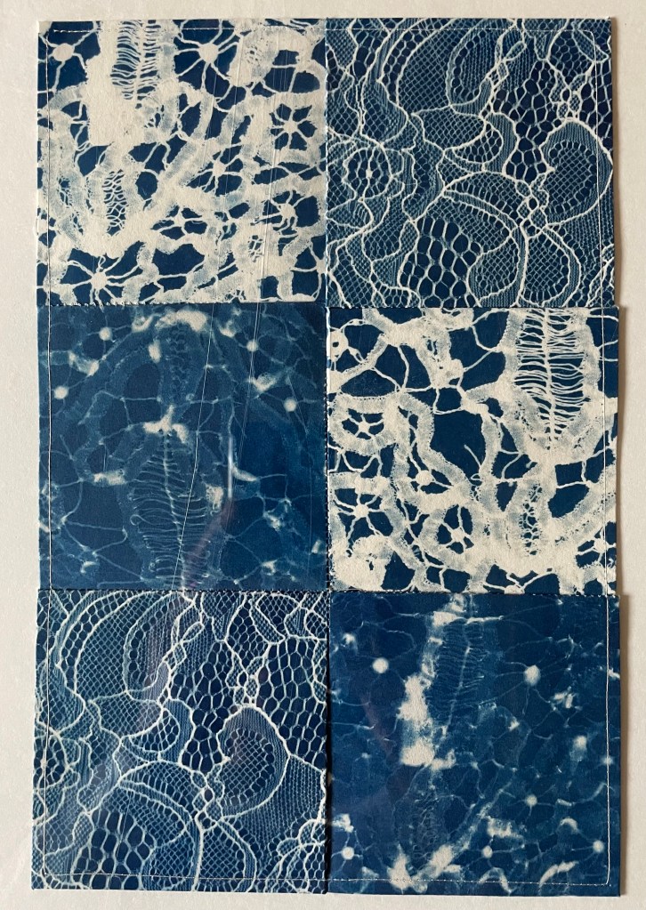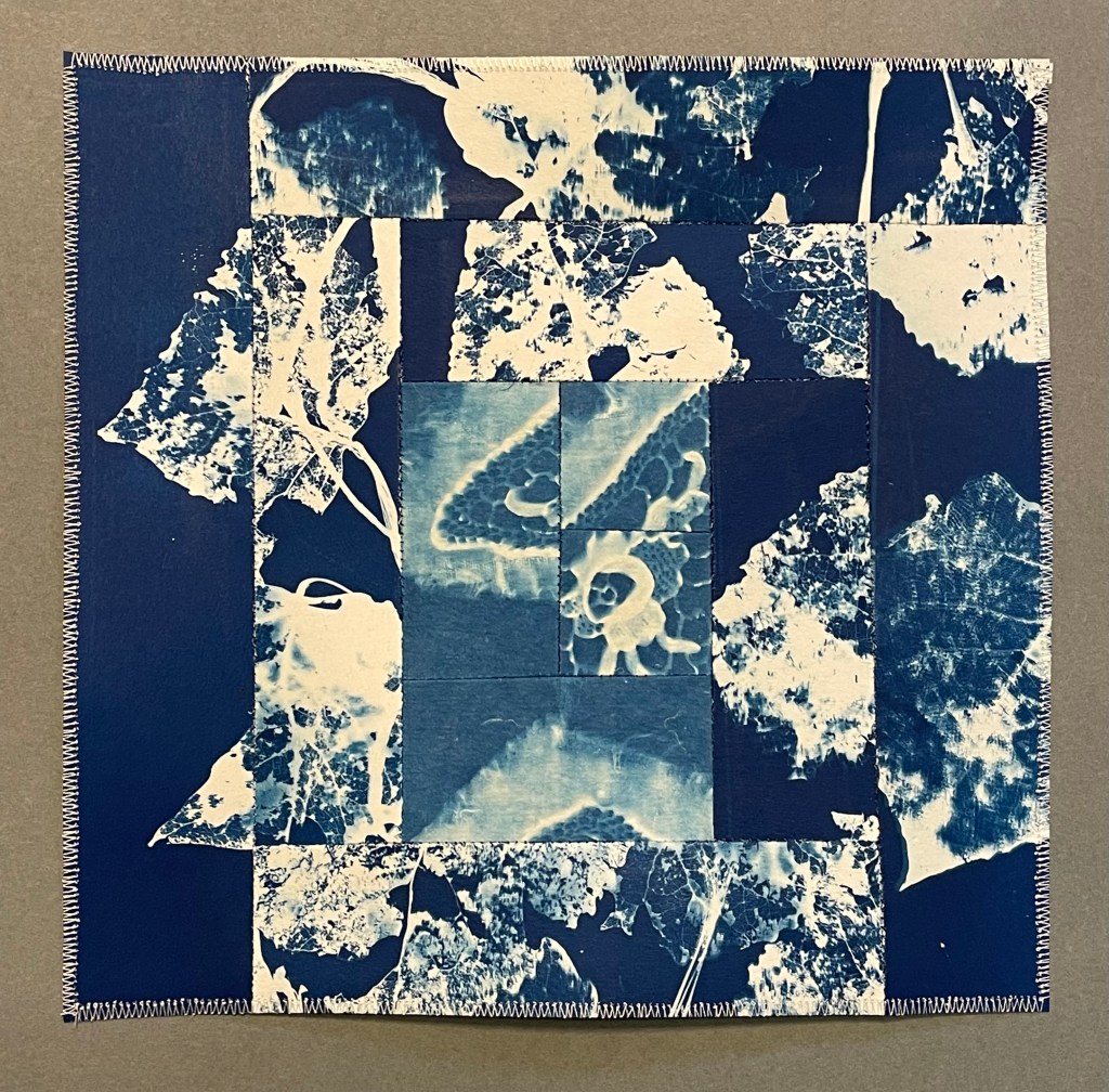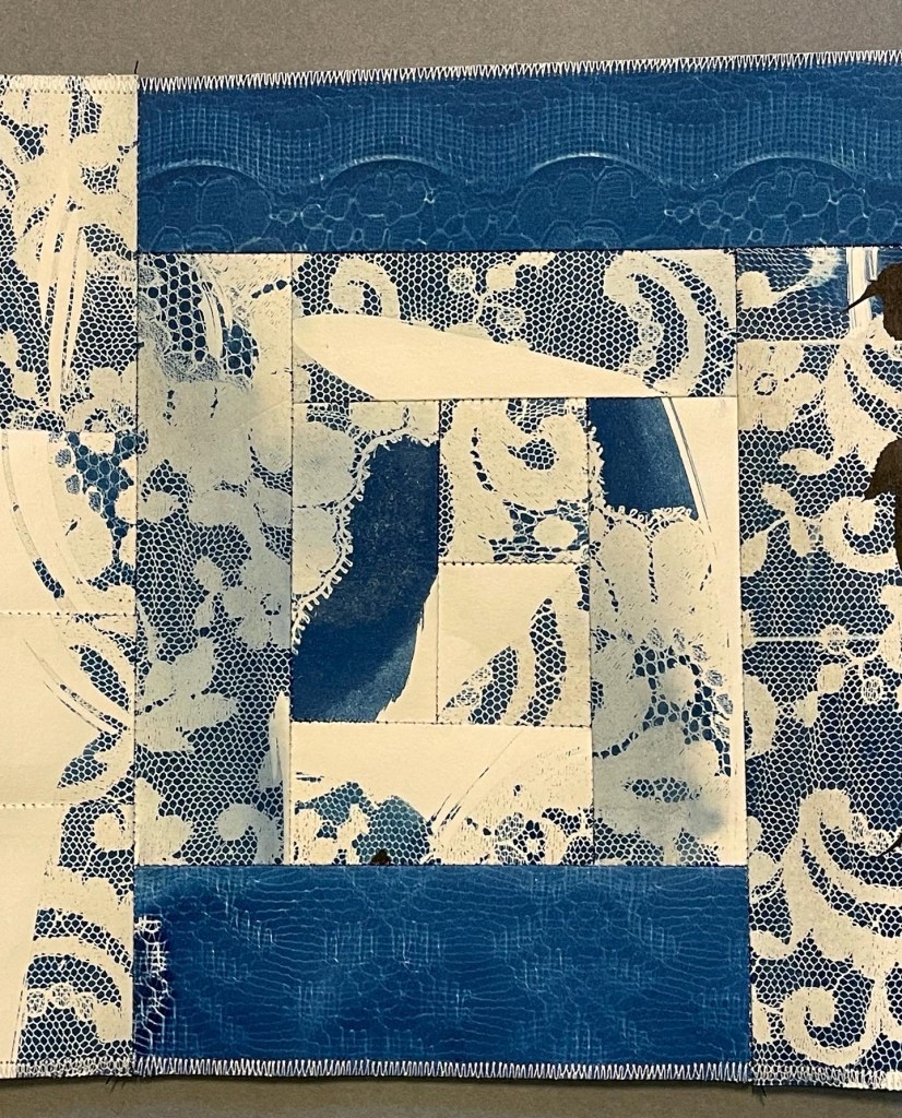 Patchworks : cyanotypes sur papiers divers, cyanotypes brodés