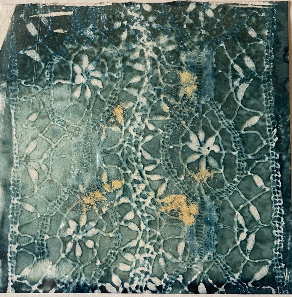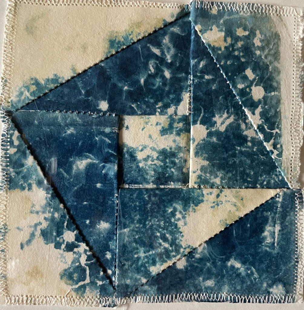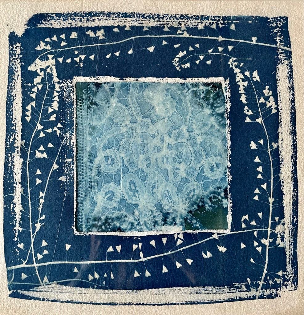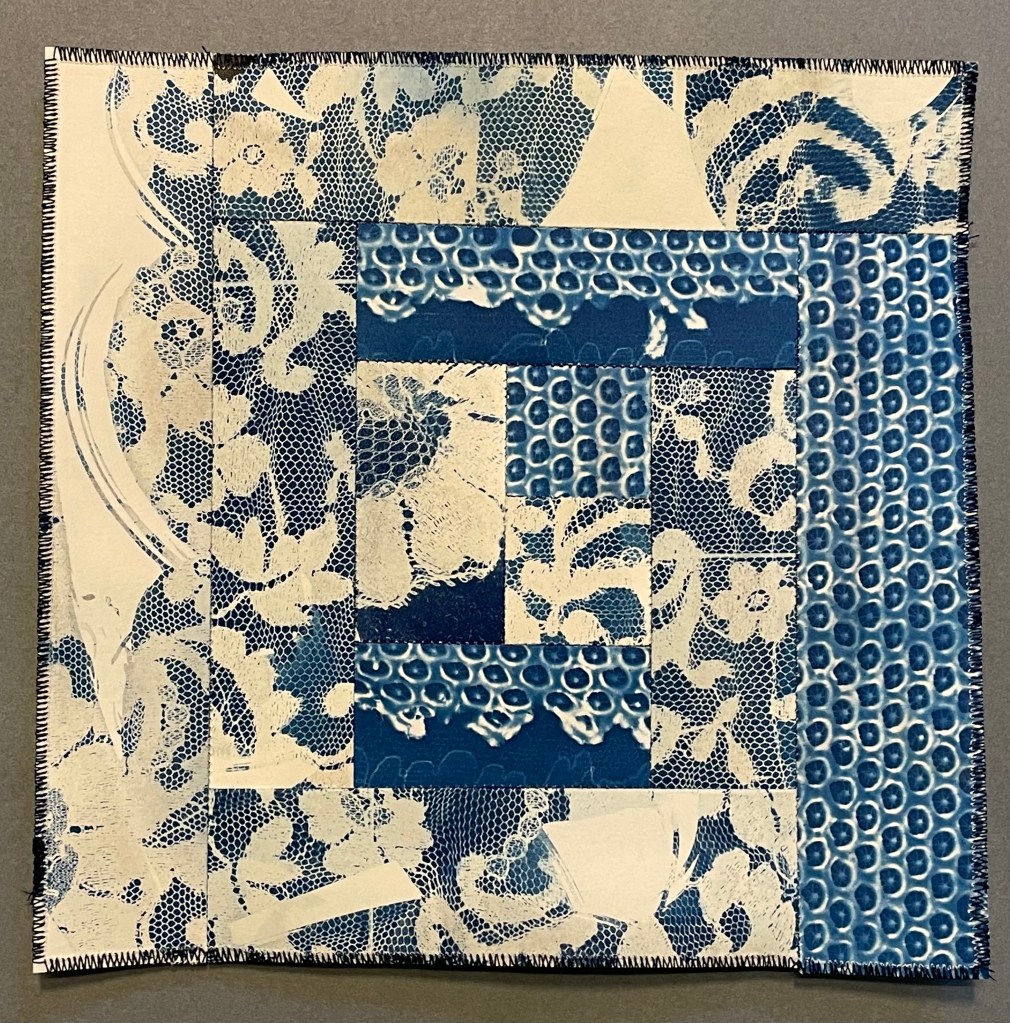 Patchworks : cyanotypes sur papiers divers, cyanotypes brodés