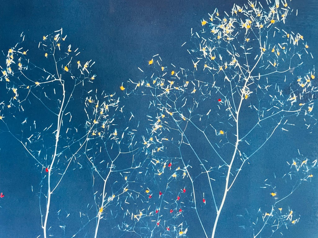 Graminé: cyanotype brodé et rehaussé de perles de verre (70 x 50 cm)
